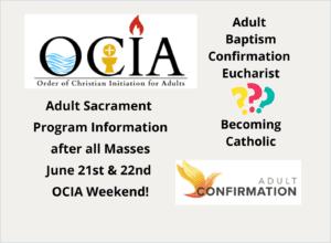 On June 21st and June 22nd, we will be offering information about Midd-South Catholics Adult Initiation Program. (The sacraments of Baptism, Confirmation and Eucharist) The Sacraments are the ways we celebrate Christ alive in the life of our faith community! Our newest parish members received their sacraments at the Easter Vigil and have been participating fully in our sacramental life. Have you received the Sacraments of Initiation? Are you being called to come closer to Jesus? We will have parishioners available to answer your questions and give information about their personal journeys in the program. Whether you need one or all of these Sacraments, we offer our company on your journey to God’s love and care. Please contact Fr. Jaime, pastor@mscatholic.org , Ami Conlan, ami@mscatholic.org Deb McGrath, 203-733-4239 (call or text) with any questions.