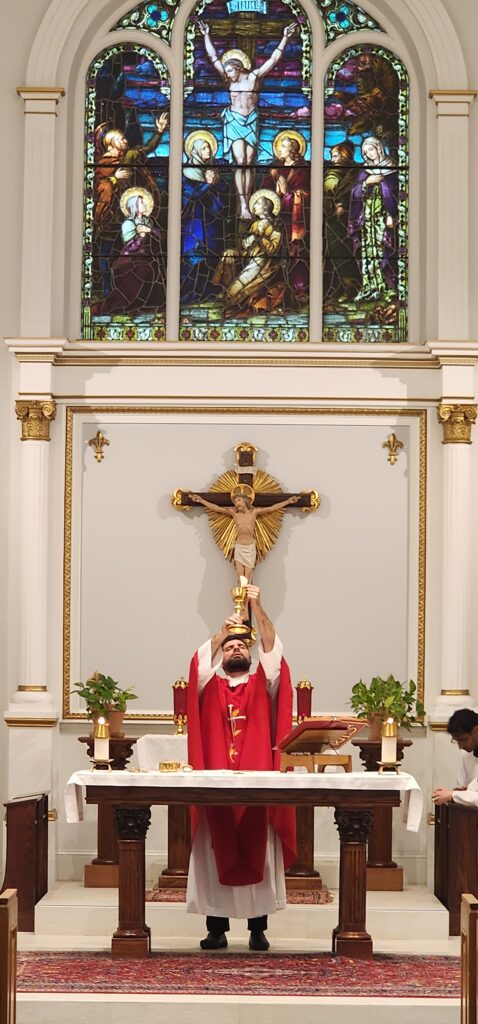 Since Jesus is present in the consecrated host, the Church holds services to adore Him in the Blessed Sacrament. We hold Eucharistic Adoration on Tuesday nights at Sacred Heart Church – find out more here!